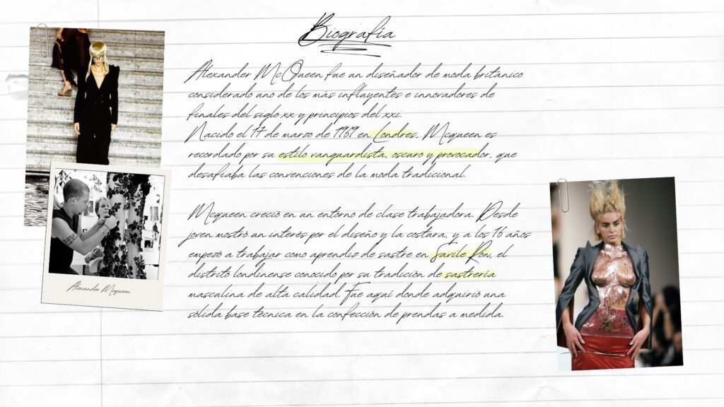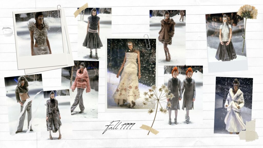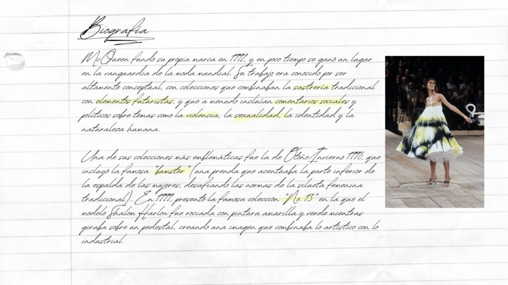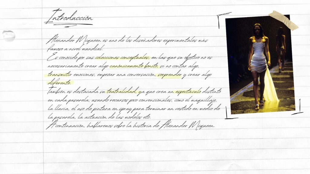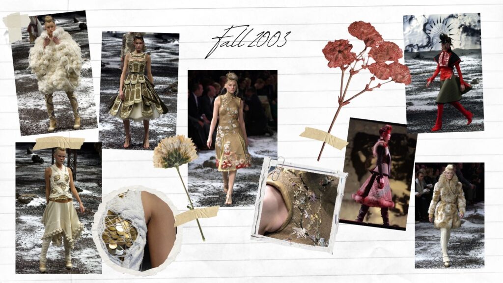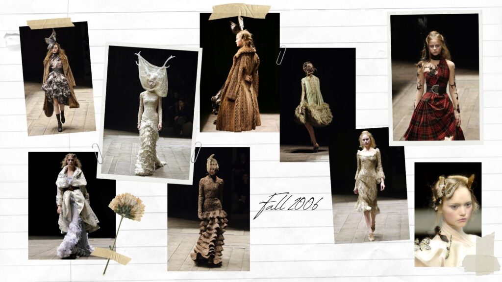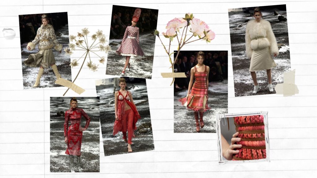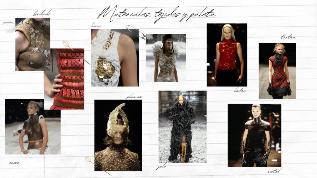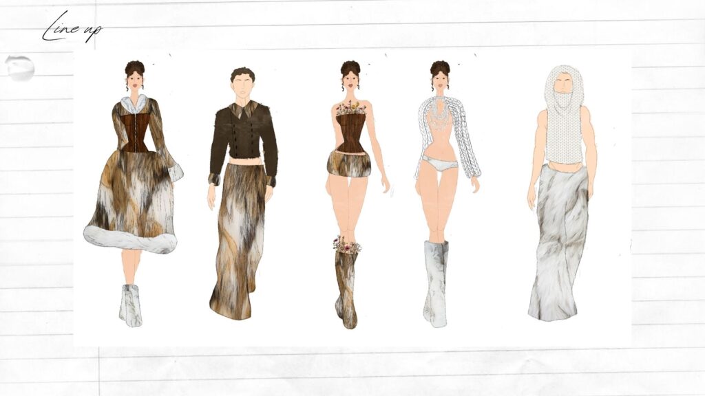 Para crear esta colección me he inspirado en Alexander Mcqueen. De esta manera, he recogido elementos de varias de sus colecciones como el uso de madera, el pelo, las flores naturales y el punto. Además, algo que solía hacer Alexander Mcqueen era buscar inspiración en películas y basar sus colecciones en ellas, por eso yo me he isnpirado en la película Anna Karenina, ambientada en Rusia en el siglo XIX, basándome principalmente en la figura de Anna Karenina y su amante Vronsky. Por eso, la colección se ambienta en un bosque nevado desértico en el cual se encuentran ambos protagonistas, intentando huir de los prejuicios de la rígida sociedad que los rodea.