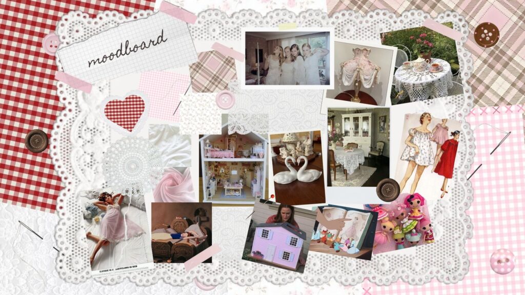 Todo esto, se manifiesta en el concepto de la casa de muñecas, un lugar pequeño, nostálgico y mágico en el que refugiarse. No es una copia exacta de la realidad, si no una realidad mejorada, en la que solo existe aquello que más nos gusta. Lleno de antiguedades raras, piezas de porcelana, cajas de música con bailarinas dentro, cajas de galletas llenas de botones agujas y ovillos de lana, camisones blancos con detalles de encaje, lámparas que parecen flores, cortinas de crochet, edredones acolchados, sábanas satinadas, libros con las páginas amarillentas por el paso del tiempo, teteras de todas las formas extravagantes que te puedas imaginar, pasteles y galletas…
