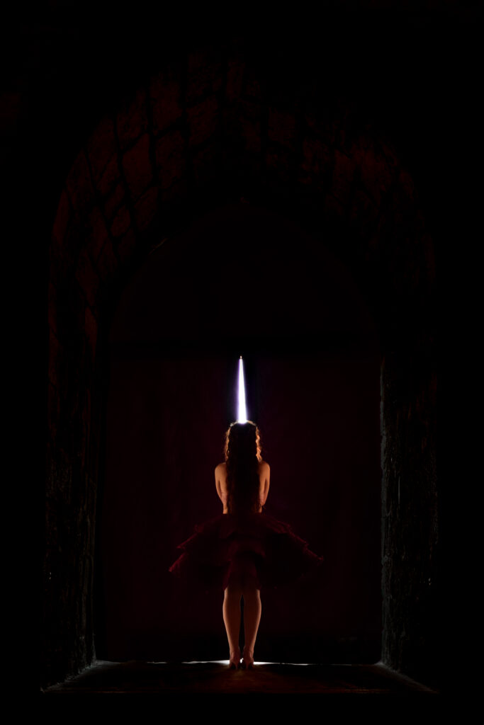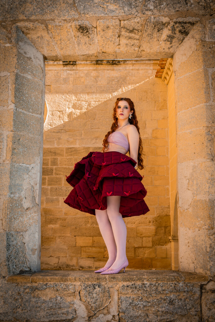 Voilé narra de manera visual la historia de cómo una mujer atrapada en un mundo que no la hace feliz consigue escapar y ser libre, todo esto con una estética inspirada en la Edad Media. Los estilismos, al igual que el resto de elementos visuales, ayudan a contar esta historia. El vestuario de la protagonista comienza con colores oscuros como burdeos y rojo y prendas muy estructuradas como corsets, cuellos altos, faldas grandes y pesadas que representan la situación en la que ella misma se encuentra. La protagonista es la reina y tiene un papel fijo del que no puede salirse en ningún momento, es infeliz, se siente atrapada y debe contenerse y fingir todo el tiempo. No puede permitirse ser ella misma. A medida que la historia se va desarrollando, la protagonista gana autonomía y libertad, esto se ve reflejado en su vestuario a través de colores más claros como el rosa y el blanco y prendas mucho más fluidas, que le permiten más movimiento y con los que al fin se siente más cómoda. De esta manera, los estilismos de este fashion film no son pura estética, son un recurso narrativo que ayuda a contar la historia, cada accesorio tiene un sentido y un significado, no son al azar. Así como cada detalle de este fashion film ha sido pensado a la perfección tanto por el equipo de moda como por el equipo gráfico que ha creado el storytelling y dirigido, editado y producido el vídeo. Con todo esto hemos querido crear un proyecto transgresor e inspirador, que transmita algo al espectador y con el cual se pueda sentir identificado.