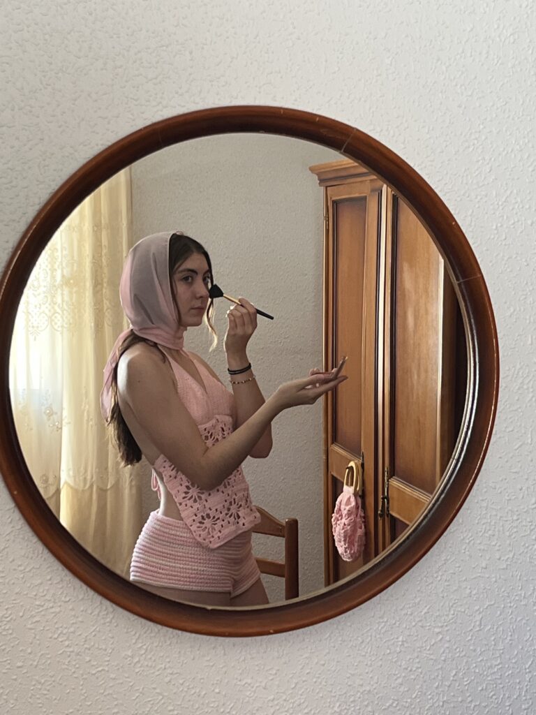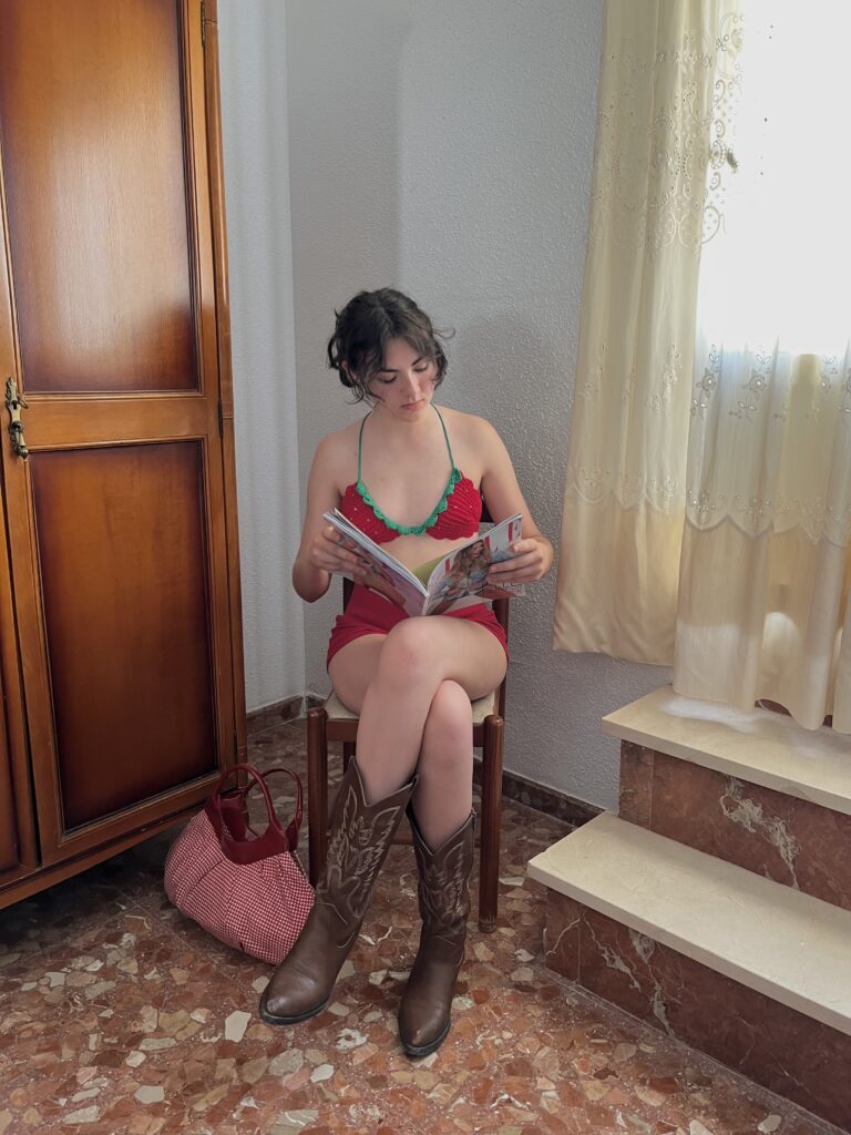 Sesión de fotos casera en la que muestro las prendas de crochet realizadas a mano por mí. Ambientada en nuestro cortijo familiar, en Cabra, Córdoba. Contiene elementos costumbristas para poner en valor la cultura andaluza y cordobesa, como el abanico, el clavel o la silla cordobesa.